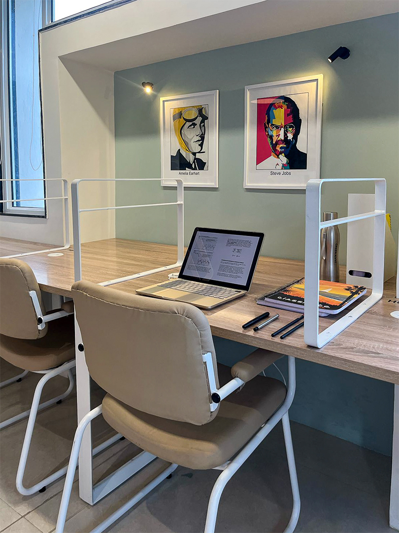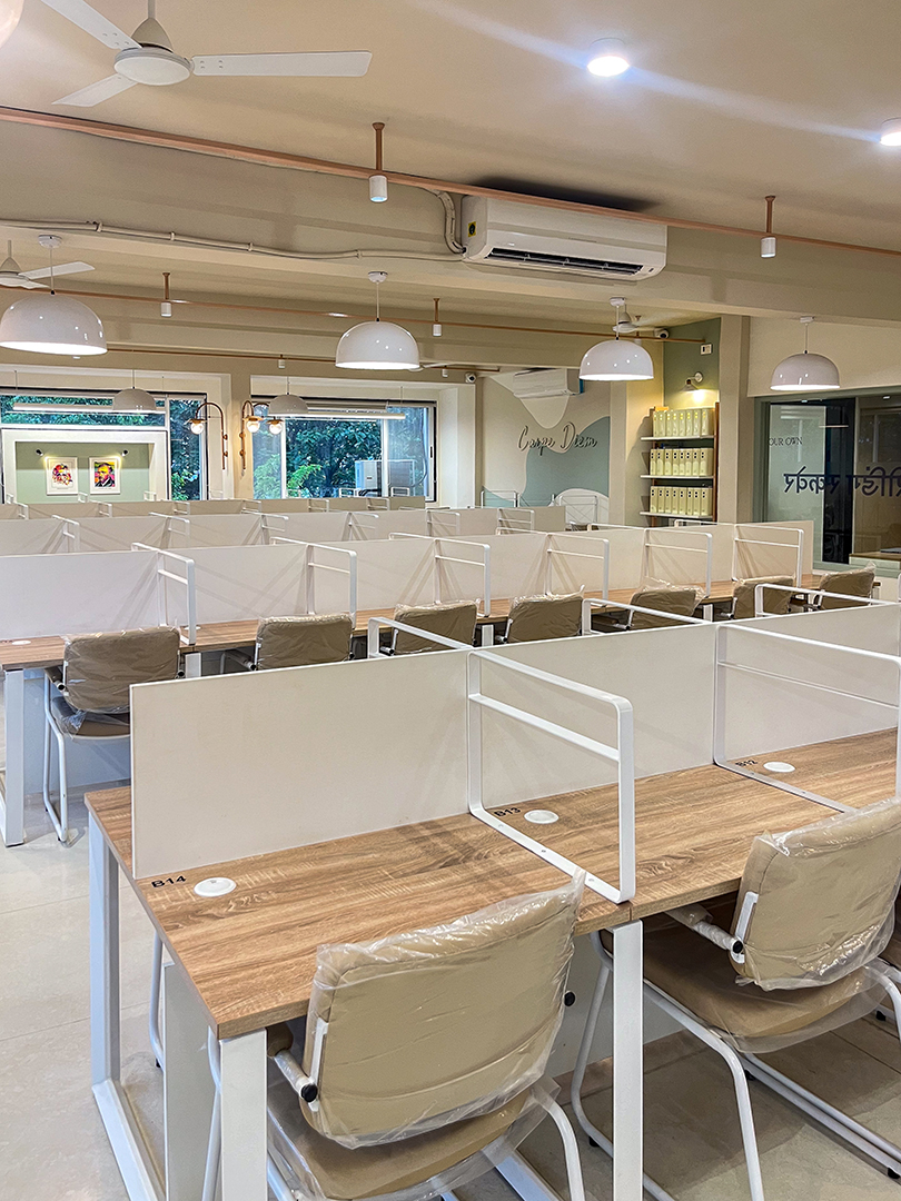 Our space is well equipped for both your online and offline needs. Elegantly designed for comfortable yet long working hours with Personal Desks & Charging Points, we ensure your privacy and yet make you feel part of a larger community. Our space is fully air conditioned and wifi enabled, with pantry services and terrace area added to give your deserved breaks.